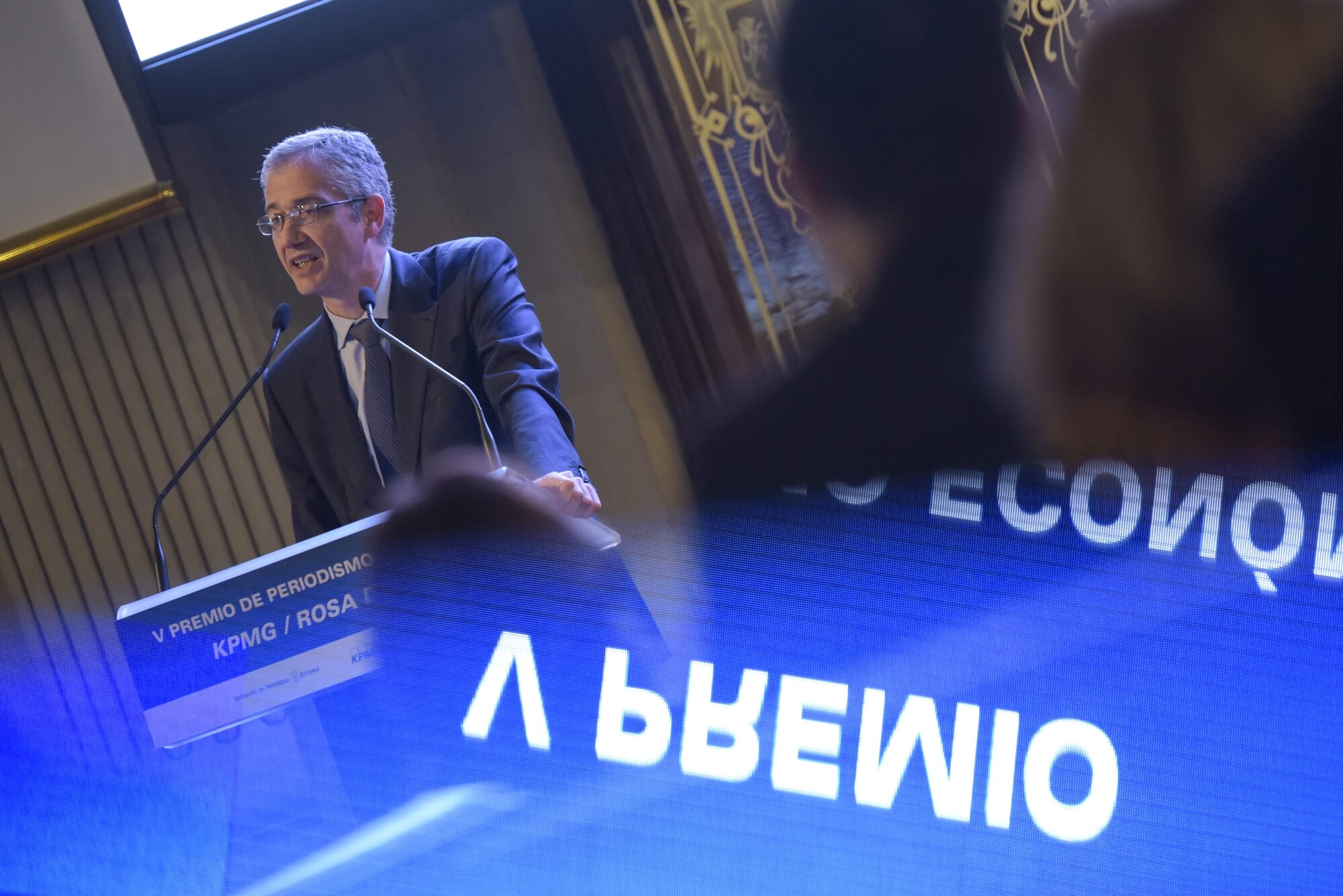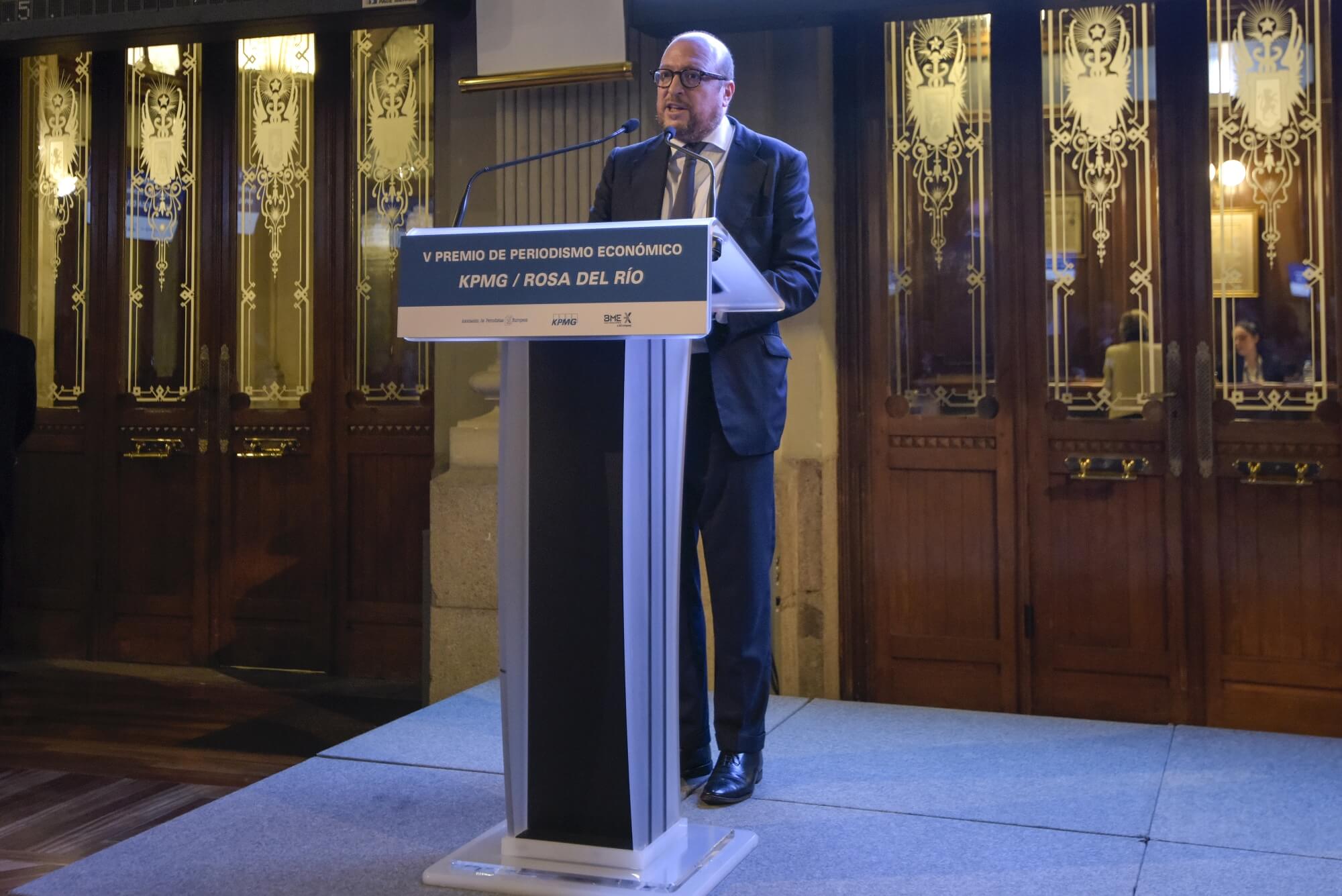 Madrid, 16 de noviembre de 2022. El Gobernador del Banco de España, Pablo Hernández de Cos, entregó en el Palacio de La Bolsa de Madrid, el V Premio de Periodismo Económico ‘KPMG/Rosa del Río’ al periodista de El Confidencial Carlos Sánchez, en un acto en el que también intervinieron David Jiménez-Blanco, presidente de la Bolsa de Madrid y vicepresidente de BME, Diego Carcedo, presidente de la APE, Roberto Bodegas, socio responsable de comunicación y marketing de KPMG y Marta García Aller, periodista de El Confidencial y Onda Cero. El Gobernador del Banco de España destacó del premiado “sus crónicas limpias, didácticas, donde lo esencial brilla y se transmite con un lenguaje claro y adaptado para todos los lectores. Pero también de añadir valor al análisis de la sustancia de los temas, al beber de muchas fuentes y aportar su propio conocimiento”.