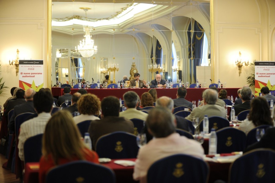 La VII jornada de Periodismo organizada por la Asociación de Periodistas Europeos en colaboración con Coca Cola España se propone analizar la nueva situación del mercado audiovisual en nuestro país y reflexionar sobre el modelo de radio televisión pública existente. La jornada estuvo formada por una inauguración, dos sesiones de trabajo y un almuerzo-coloquio de clausura a cargo de la Vicepresidenta Primera del Gobierno, María Teresa Fernández de la Vega.