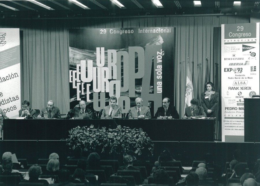 PATROCINADO POR: BANCO POPULAR ESPAÑOL, BANCO CENTRAL, TURESPAÑA, EXPO 92, GRUPO ENDESA, RENFE, RANK XEROX, FUNDESCO, FUNDACIÓN PEDRO BARRIÉ DE LA MAZA, ALSA, IMADE Y FUNDACIÓN PRÍNCIPE DE ASTURIAS. CON LA COLABORACIÓN DE: OFICINA DE LA COMISION DE LA CE EN MADRID, OFICINA DEL PARLAMENTO EUROPEO EN MADRID, JUNTA DE ANDALUCÍA Y AYUNTAMIENTO DE SEVILLA.